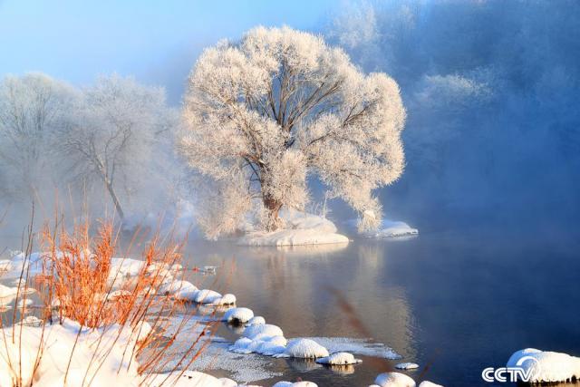 12 月 17 日本,黑龙江黑河逊克县出现雾凇景观,水面雾气蒸发,映衬玉树琼枝,美丽梦幻。