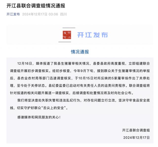 四川开江通报生猪屠宰黑窝点乱象:已关闭 5 一家屠宰厂,启动追究责任的程序。