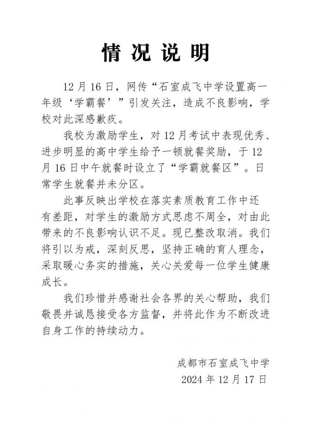 12 月 17 日本,成都市石室成飞中学发布情况说明,学校激励学生,是的 12 每月考试成绩优异、进步明显的高中生给予一次就餐奖励, 12 月 16 日中午就餐时设立了“学霸就餐区”,日常学生就餐没有分区,现已整改撤销。