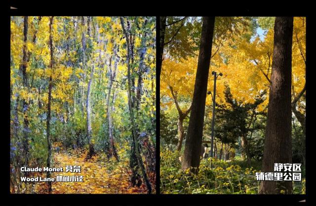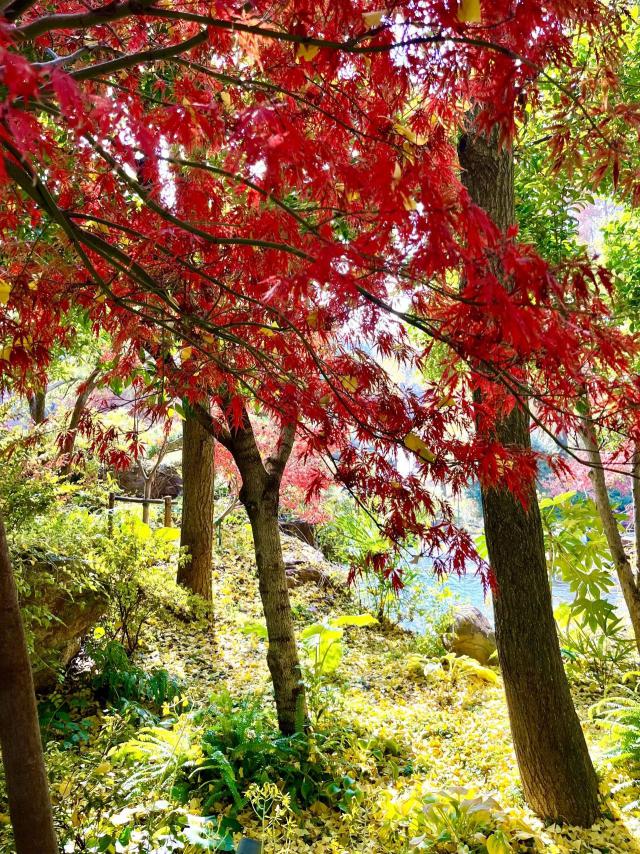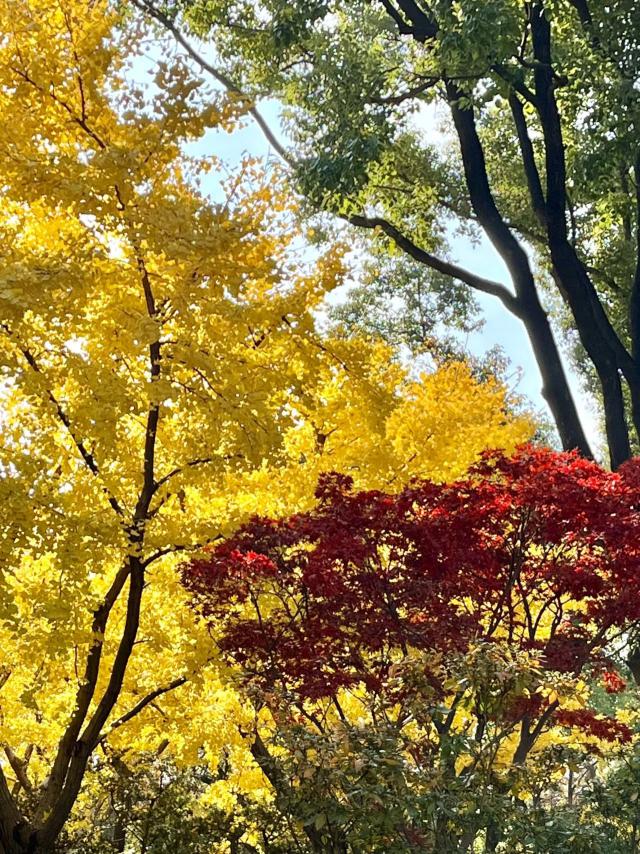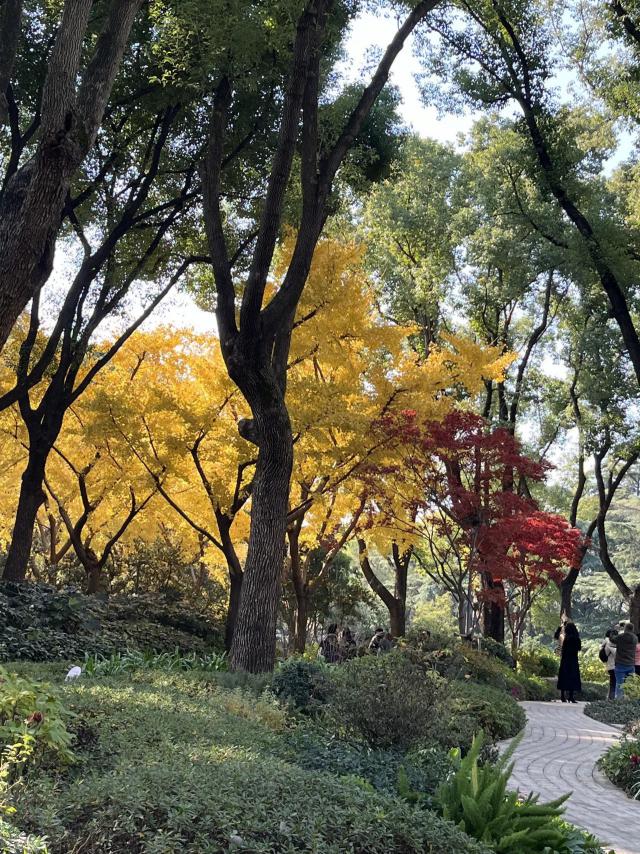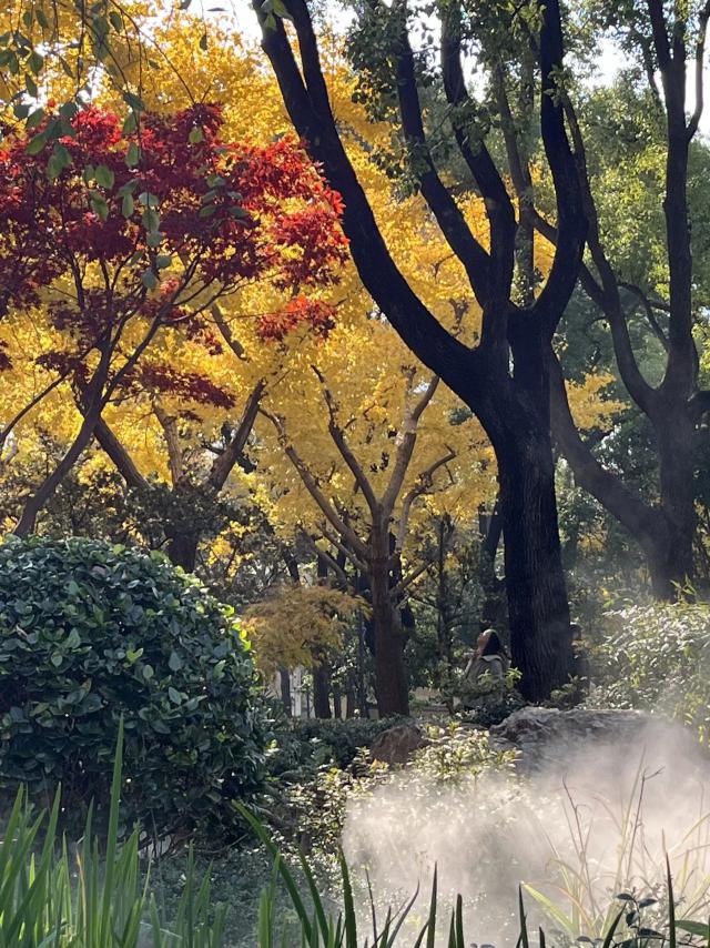 园内落金银杏,枫叶红透,
