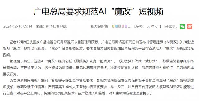 针对这种现象,12 月 7 日本,广电总局网络视听司发布《管理提示(AI 魔改)》,明确提出,这些视频为了获得流量,没有底线篡改经典作品,与原有的精神内核背道而驰,涉嫌侵权。同时,《管理提示》还提出了具体的管理要求,包括督促短视频平台进行调查和清理 AI 影视剧《魔改》短片,认真落实生成式人工智能内容审核要求等。