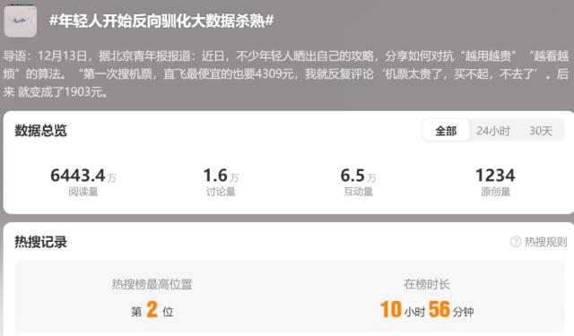 这次“反向驯化”成为热点也不失为一个提示:围绕“大数据杀熟”还有一系列行业痛点需要重点处理。
