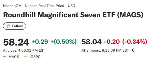 特斯拉、谷歌、亚马逊和苹果都在周一创下历史新高。即使在周二,三大股指普遍下跌的情况下,跟踪这七家公司的Roundhillll。 Magnificent Seven ETF(MAGS)仍达到新高。