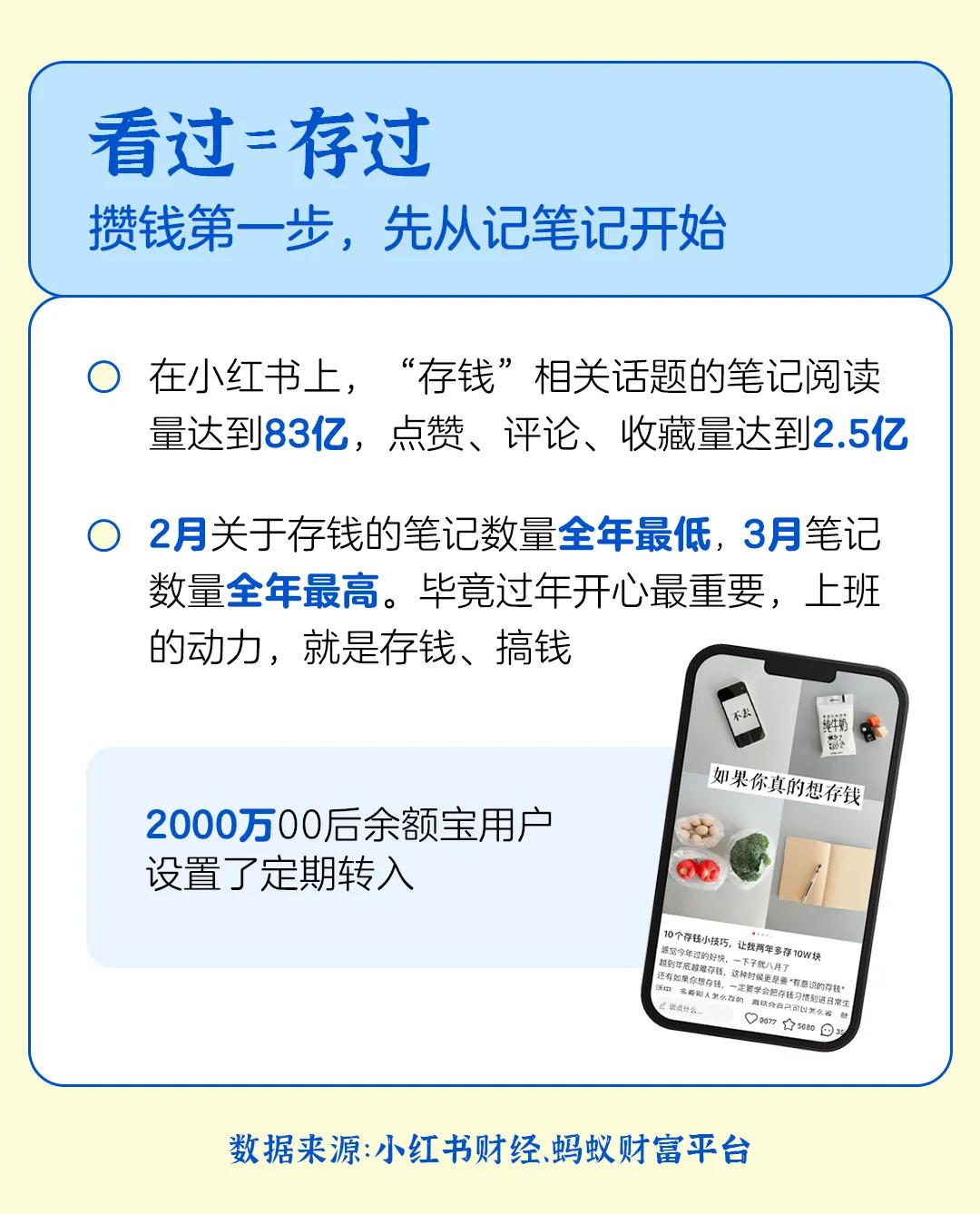 当然,如果你想靠利息生活,你必须先存足够的钱。存钱的第一步是从会计开始。新年伊始,年轻人通常对存钱感兴趣,尤其是3月份,网友在小红书搜索“存款”的次数达到了顶峰。毕竟一年到头上班的动力就是存钱赚钱。数据显示,2000万后,余额宝用户定期转账。看着账号越来越大,他们的财产也越来越厚。