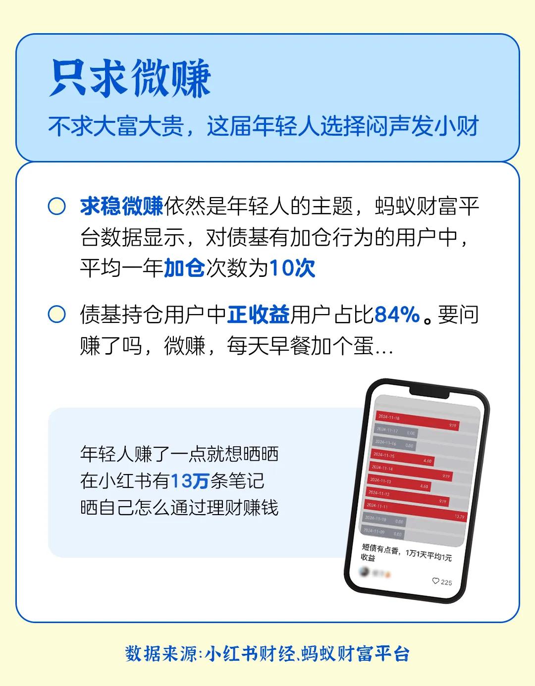 这反映了2024年很多年轻人的理财心态——只求微赚。如果你能赚到一点,你就能得到一点阳光。今年,小红书上有13万个笔记在晒你通过理财赚钱的结果。蚂蚁财富债务基础持有的客户中,正收益占84%。理财不应该起起落落,默默发大财。怎么可能不机智?
