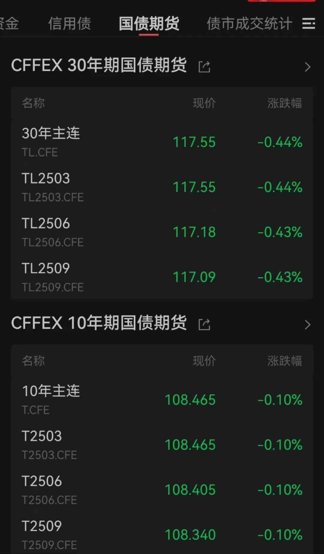 Wind数据显示,国债期货下午下跌,大部分收盘下跌,30年主力合约下跌0.44%,盘中下跌1.75%。;主力合约在10年内下跌0.1%,主力合约在5年内下跌0.02%,主力合约在2年内持平。