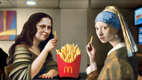次要的墙壁都被打破了,当然也可以让名画跨时代互动——蒙娜丽莎和戴珍珠耳环的女孩在麦当劳餐馆吃薯条。
