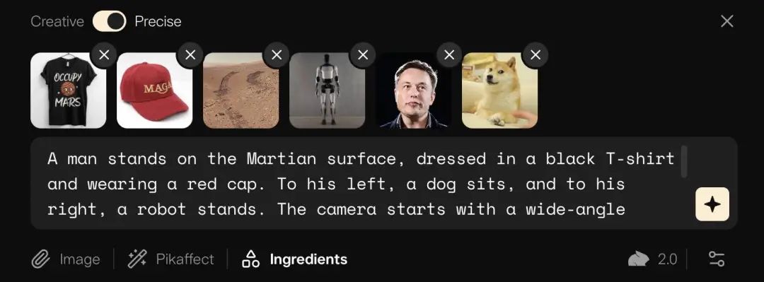 接着,把这些照片,火星的场景,马斯克的照片,以及他的擎天柱人形机器人,他特别喜欢的网红表情包 Doge 原型,全部上传至 Pika。