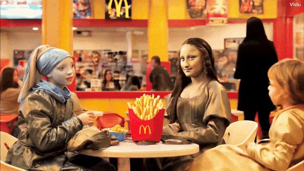 提示:戴珍珠耳环的蒙娜丽莎和女孩正在麦当劳餐馆吃饭。他们坐在对面,桌子上放着薯条。他们边聊边品尝薯条,相机从侧面捕捉。两个角色偶尔看着镜头,营造出一种随意友好的氛围。