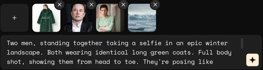 因此,我们可以让马斯克和奥特曼沉迷于模特。只上传一张服装图片,然后让他们穿同样的绿色外套,通过提示拍一部时尚大片。