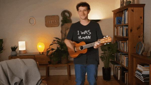 提示:一个穿黑色衣服的人 T t恤的男人站在温暖的房间里,弹着尤克里里琴。镜头从远处看,呈现出他的全身,逐渐拉近,最后聚焦。 T t恤上的字迹