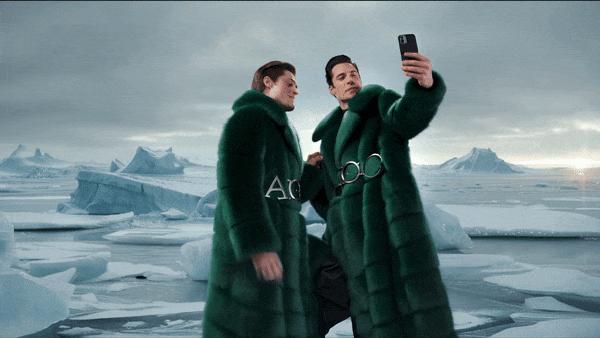 他们俩都找到了现成的照片,绿色的外套和冰雪的背景是另外用的。 AI 产生的,衣服上的「AIGC」,算是考验 Pika 的附加题。