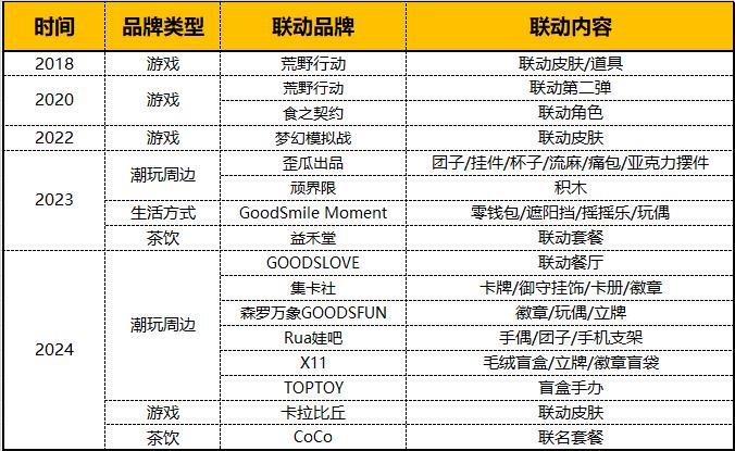 到2023年,广州领之睿获得了《POP子与PIPI美的日常生活》的IP国内运营权,商业授权频率和联动规模明显提升,联动品牌类型也有所扩大。除了游戏,它还与衍生品、茶、时尚游戏、日用品等品牌联动。2024年,IP授权联动覆盖的品牌类型依然多样,但品牌影响力和消费者规模进一步扩大。