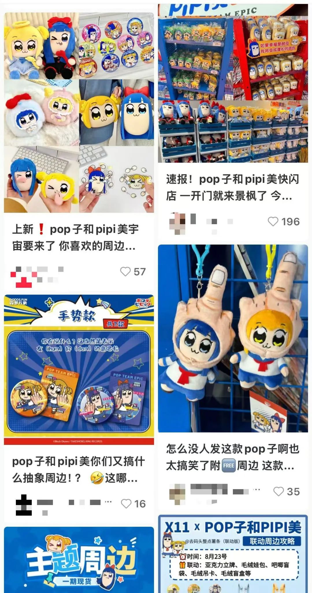 按理说,这些随着二创流量而流行的角色随时都有可能被取代,但POP子和PIPI美在互联网上有了一种全新的形式,那就是“大米”。通过国内版权代理商的商业运营,角色分享和讨论衍生产品原有的二创内容,两个角色再次受到年轻人的关注。