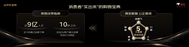 今年以来,近9亿人通过金榜下单,近80%的消费者在浏览JD.COM金榜后,不到10秒就能找到自己喜欢的产品。由于评价制度的公平客观性,金榜继续受到众多消费者的信赖。目前,商品的销售、口碑、知名度、品牌力和增长率是登上金榜的重要指标。这些指标综合反映了消费者的实际购买选择、体验和评价反馈。正因为如此,JD.COM的金榜才不断成为消费者购物决策的可靠指南。