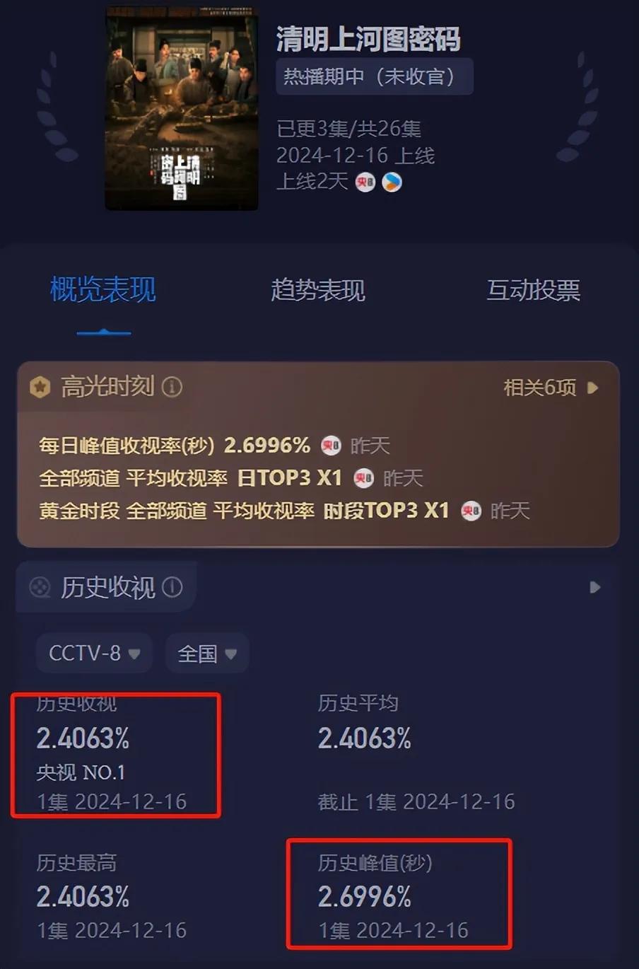 这是新剧《清明上河图密码》第二集的开头故事。以张择端《清明上河图》为原型创作的悬疑侦探故事,既有宋代的人文风貌,又有惊心动魄的悬疑剧。上线12小时后,剧集人气突破7000,电视收视率突破2.6。
