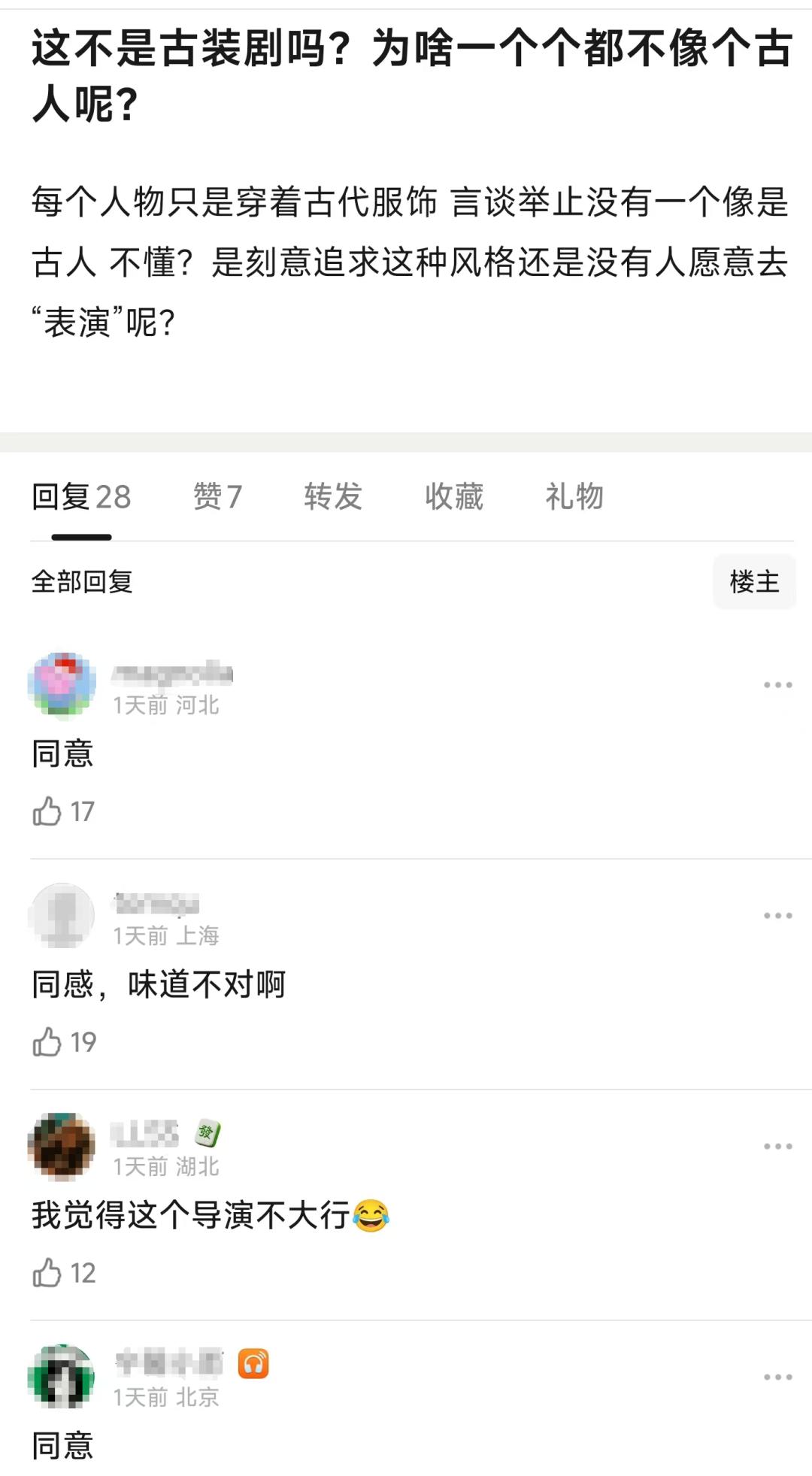 这部剧的主要差评也集中在这里。有观众吐槽说:“每个角色只穿古装,他们的言行都不像古人。不知道是刻意追求现代感,还是没人愿意表演,让人很难入戏。”