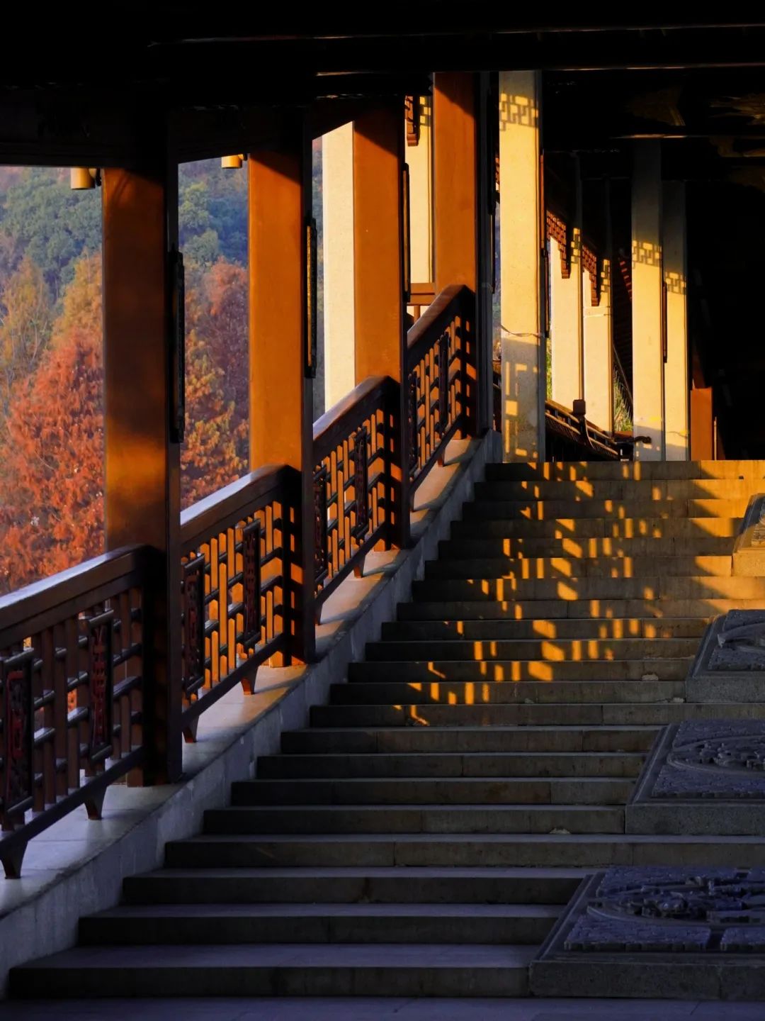 桥两侧的红木雕刻着精美的图案。