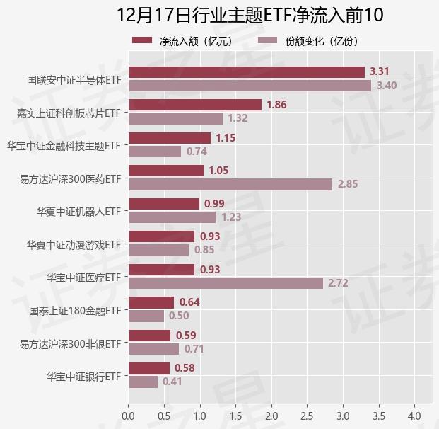 当天有 128 只行业主题 ETF 资金净流入显示,其中国联安中证半导体净流入排名第一。 ETF(512480),份额增加 3.4 十亿份,净流入额为 3.31 亿元。