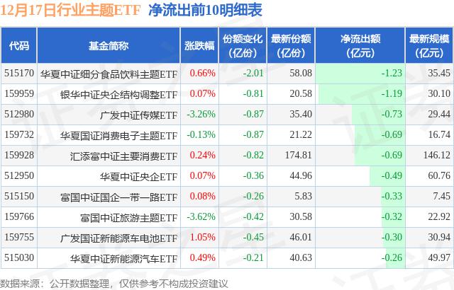 当天有 108 只行业主题 ETF 资金净流出出现在基金中,其中华夏中证细分食品工业主题排名第一。 ETF(515170),份额下降 2.01 一亿份,净流出额为 1.23 亿元。