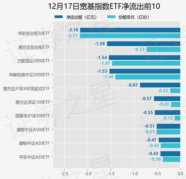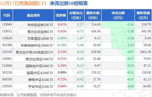 当天有 48 只宽基指数 ETF 资金净流出,其中华安创业板净流出排名第一。 50ETF(159949)减少了份额 2.17 一亿份,净流出额为 2.16 亿元。