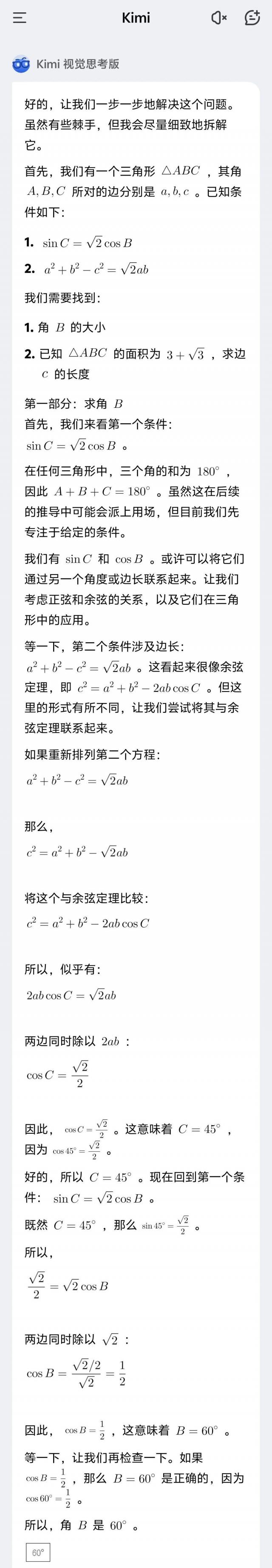 第( 2 )题目有点难,但是差评君仔细检查了一遍又一遍。 k1 解决问题的过程,思路和解决方法都没有问题,最后边长。 c=2 √ 2 答案也是正确的。(因为这个问题 k1 思考的过程真的太长了,截图就不展示了。)