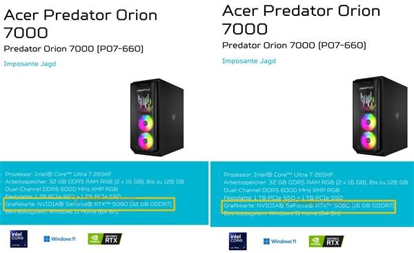 旗舰台式机宏邈 Predator Orion 7000 即将迎来升级,将配备升级。 RTX 50 系列显卡,客户可以选择旗舰级别。 RTX 5090 或次旗舰 RTX 5080。根据泄露的宣传资料,RTX 5090 将搭载 32GB GDDR7 显存,而 RTX 5080 则配置 16GB GDDR7 显存。RTX 5090 采用的 GB202 芯片,其显示存位宽度升级到 512 bit,满足专业需求 AI 需要负载。