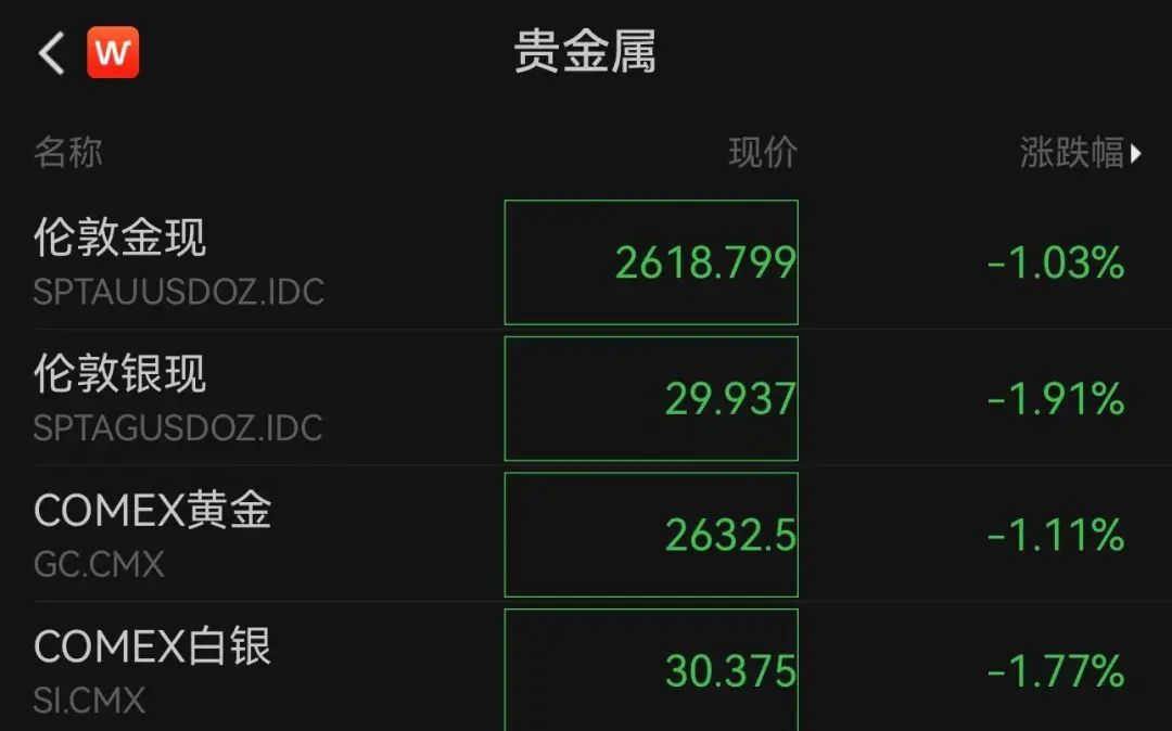 现货黄金的短期下跌一度扩大到近22美元,现报告为2618.799美元/盎司。现货白银一度在当天下跌超过2%,现报告为29.937美元/盎司。