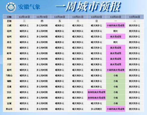 22日(周日):全省白天晴天到阴天;夜间临江西部和大别山区多云转阴天有雨夹雪或雪,其他地区多云转阴。
