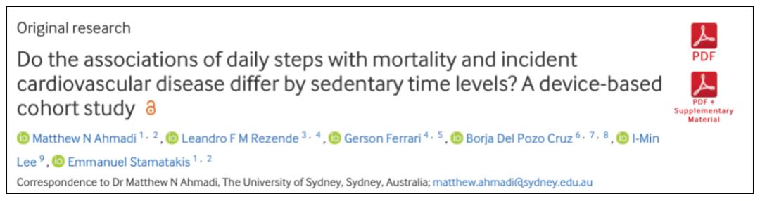 ②Do the associations of daily steps with mortality and incident cardiovascular disease differ by sedentary time levels? A device-based cohort study. Br J Sports Med. 2024 Mar 8;58(5):261-268.
