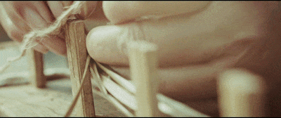 早上,叮叮当当的锤子打破了农舍的宁静。锤子抬起落下时,木楔牢牢地嵌入木桩中,草快速盘绕、捆绑、缝合,手指灵活地穿梭在木楔之间。在繁忙细致的编织中,一件传统的手工制作的衣服就完成了。