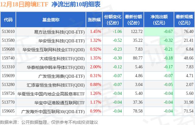当天有 19 只跨境 ETF 资金净流出基金,其中E基金恒生科技在净流出中排名第一。 ( QDII-ETF ) (513010),份额下降 1.06 一亿份,净流出额为 6651.04 万元。