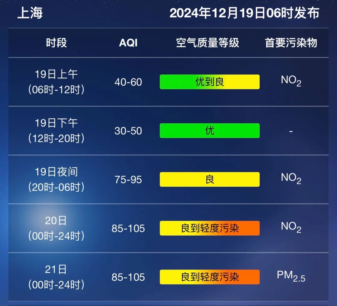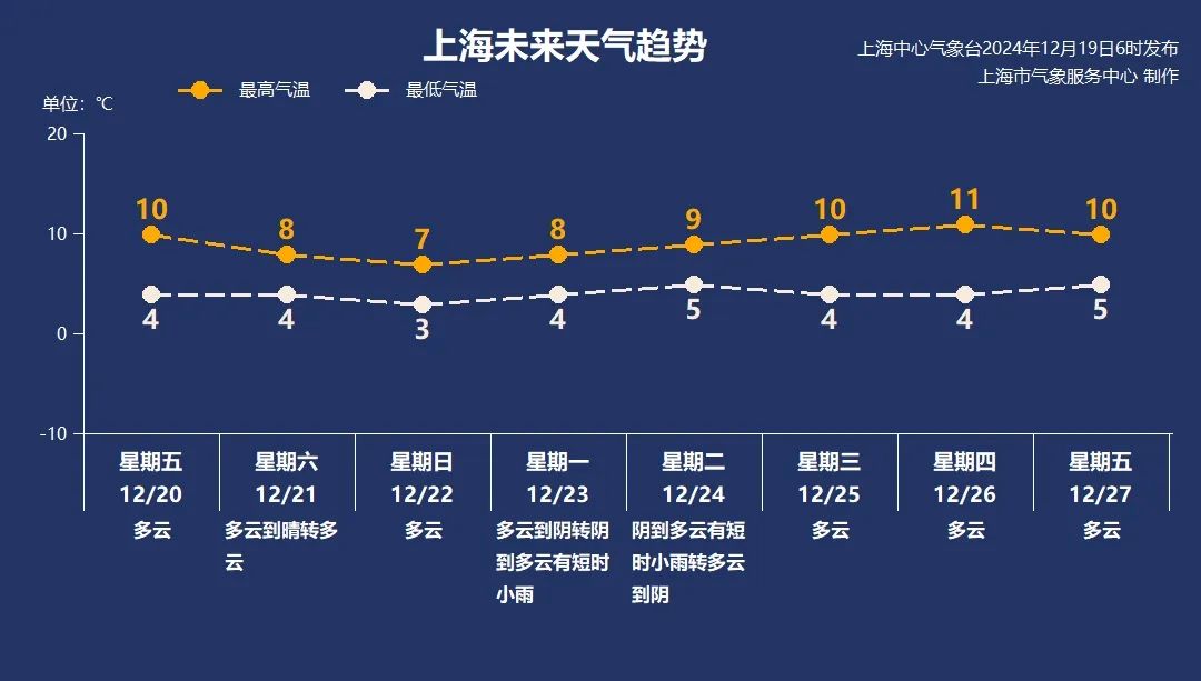 今日(12月19日)上海云系仍较多,以多云至阴为主。风速有所下降,北至西北风3~4级。早晨全市最低气温基本在1~4℃,预计白天最高气温也只有8℃左右。相对湿度为80%~50%。