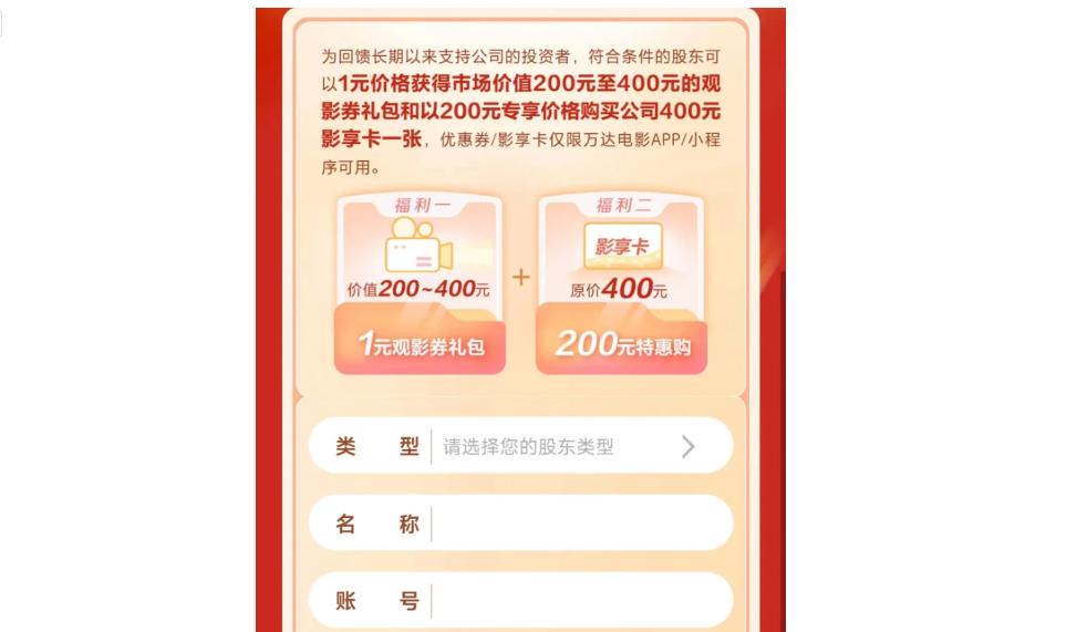 5月21日晚,万达电影宣布,为了回馈长期支持公司的投资者,符合条件的股东可以以1元的价格获得一份电影券礼包(平均市场价值200元至400元),以200元的专属价格购买一张公司400元的电影券礼包(即200元的电影券礼包)。两个活动可以同时参加,也可以选择一个参加,这也是万达电影连续第四年向股东赠送1元观影券的礼包。