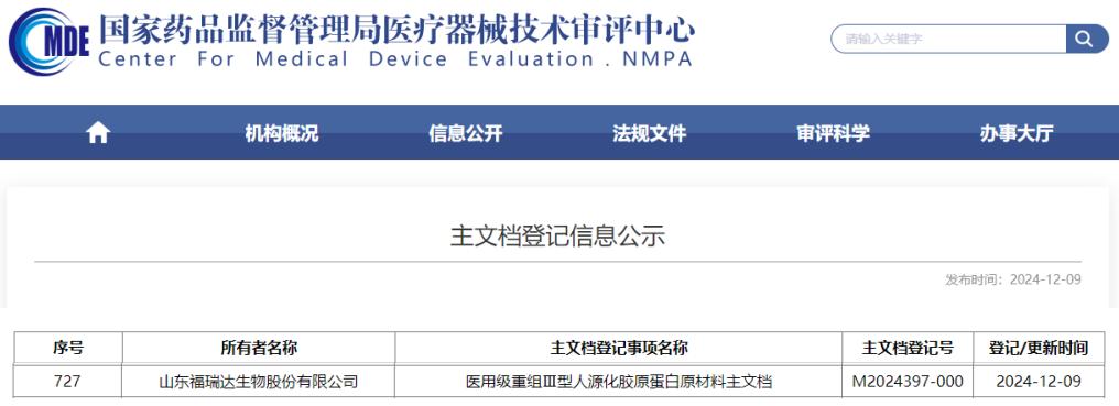 与此同时,头部企业福瑞达继续重组胶原蛋白跑道。同日,福瑞达在其官方微信微信官方账号披露,其研发的医用级重组是根据国家医药产品管理局医疗器械技术审评中心官网公布的。Ⅲ主文档登记(主文档登记号:M2024397-000)已成功完成型人源胶原蛋白原料。