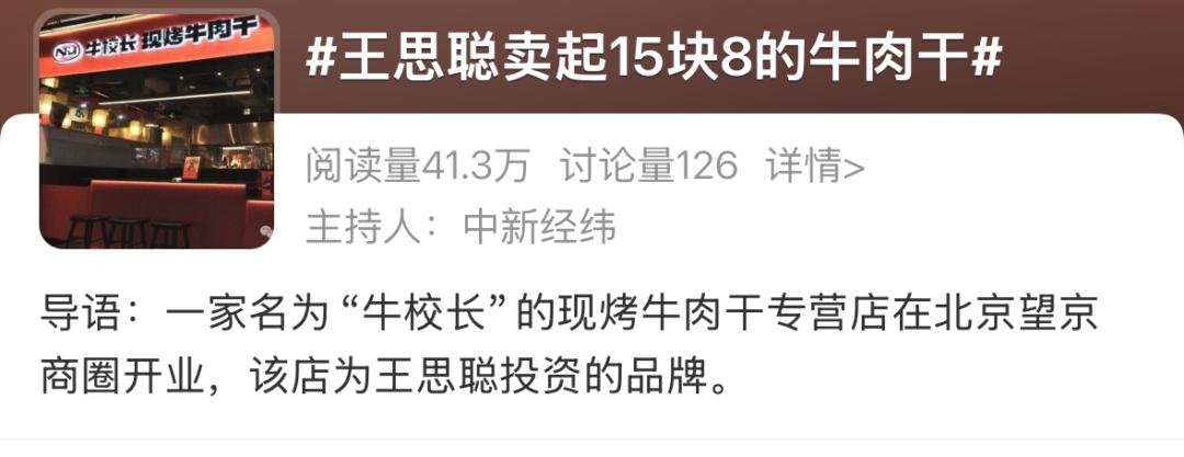 值得一提的是,不久前,王思聪再次进入餐饮行业,引起了人们的关注,并登上了热搜。这一次,比王思聪本人更引人注目的是,有媒体报道称,新开的牛校长现在正在烤牛肉干店,美团“西冷牛排纯瘦”的最低价格只有13.8元。