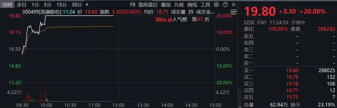 上午通信设备概念股全线上涨,液冷服务器方向领涨。板块指数低空后,直线上涨。仅仅10分钟左右,就从跌幅超过1%变成了涨幅超过2%。半天的交易接近昨天的全天交易。高澜股份和锐捷网盘均有20%的直线涨停,康盛股份、佳力图、光迅科技等。也是垂直封板。