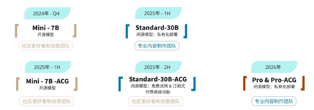 根据图森的R&D计划,Ruyi 不同版本将继续迭代,明年至少推出三款,即开源模型。 Mini-7B-ACG、闭源模型 Standard-30B、闭源模型 Standard-30B-ACG,其中 Standard 支持生成版本 1080P 拍摄级画面质感。到了 2026 2008年,图森将推出最强性能版本,支持 2K HDR 拍摄级图像纹理,支持多条件可控生成。
