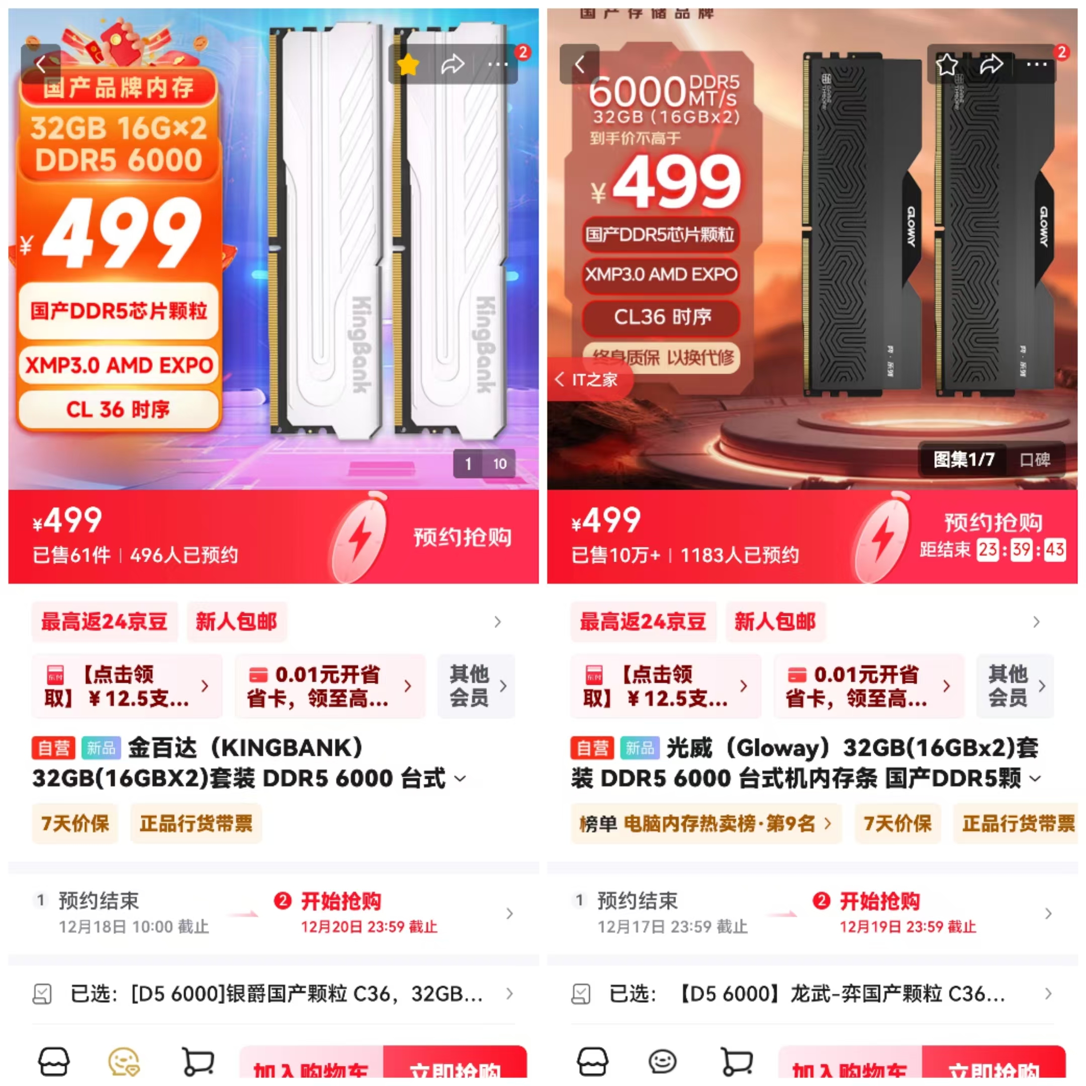 两款产品最大的亮点就是采用了国内首款量产DDR5内存颗粒方案,金百达和光威在产品详情页上重点介绍,光威还重点介绍了“手工挑选”,也许是在暗示内存颗粒的“体质”会更好,方便用户后期超频。