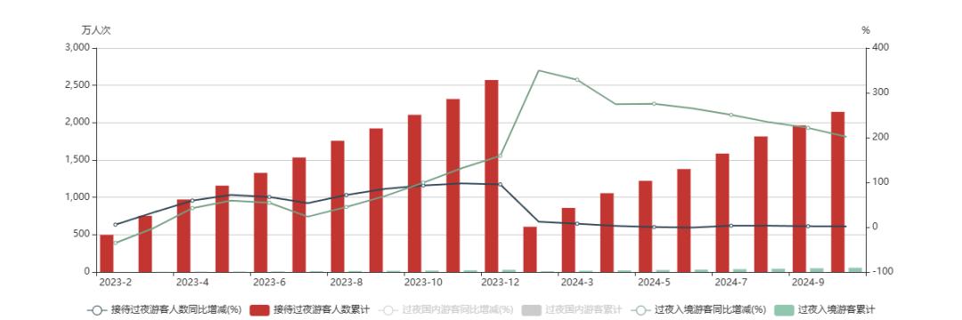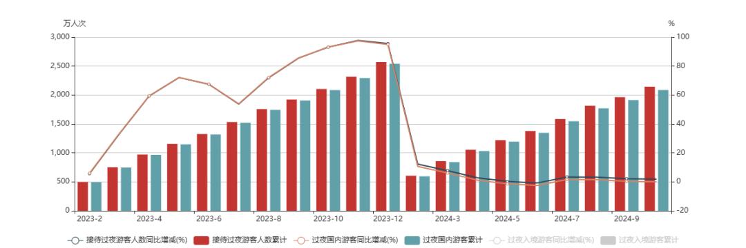 三亚官方统计的一组游客接待数据也可以证明这个市场正在发生变化。仅从2023年2月至2024年10月三亚招待过夜游客数量来看,国内游客同比增速基本呈悬崖式下降趋势。与去年相比,今年5月和6月的旺季甚至是负增长。