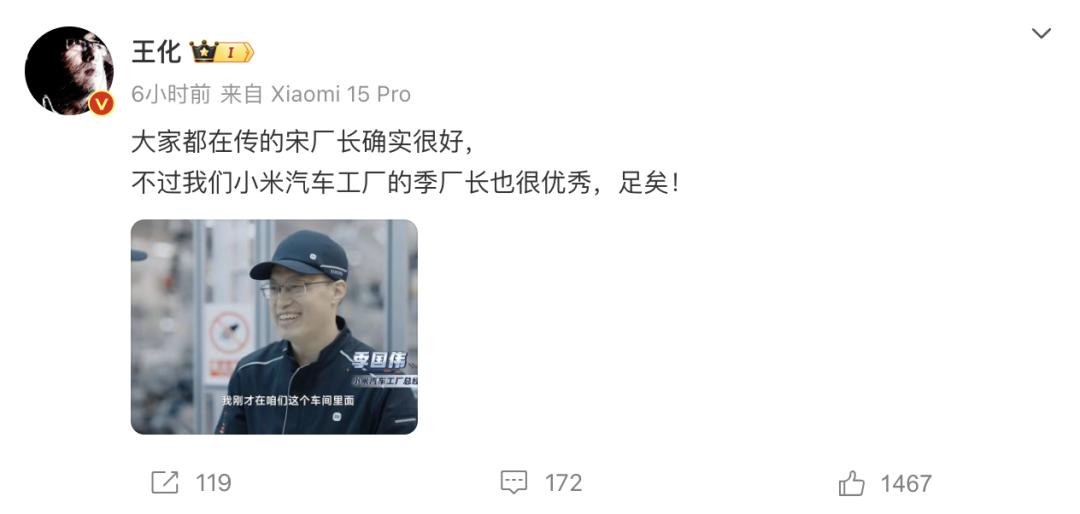 小米公关部总经理王化说:“宋厂长(宋钢)确实不错,但是我们小米汽车厂的季厂长(季国伟)也很优秀,够了!”