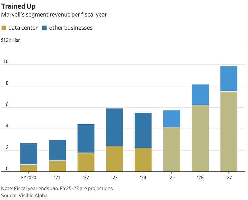 分析人员估计,2025财年Marvell的AI收益将达到2025财年18亿~20亿美金,2026财年AI收益可能达到50亿美金,远远超过25亿美元的管理保守估计。