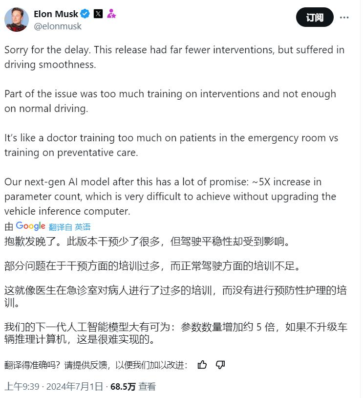 之前马斯克解释过 FSD V12.4.2 由于延迟发布的原因,他们发现投喂了大量需要人工接管的复杂场景数据后,机器在简单场景中的驾驶平顺性反而后退。