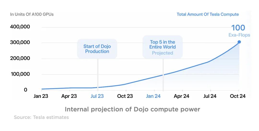 至少在计算率方面,特斯拉还是相当领先的。特斯拉之前透露的是,今年 十月份,计算率将达到 100 ExaFlops (还有信息 87.5 ExaFlops )。