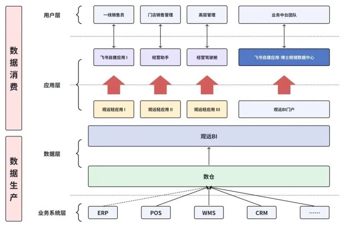 首先,我们应该定义组织中数据运营的价值创造路径。如图所示,底层为业务系统层,所有业务数据汇集到数据仓库,然后进入BI使用层。由于观远BI已经深度融合了飞书,用户无需直接与观远BI系统进行交互,所以这里有一个独特的设计。在飞书中,不同层次的用户可以满足各种工作需求和数据需求。这样就保证了顾客取数用数,不需要跳出飞书,就可以实现闭环操作。