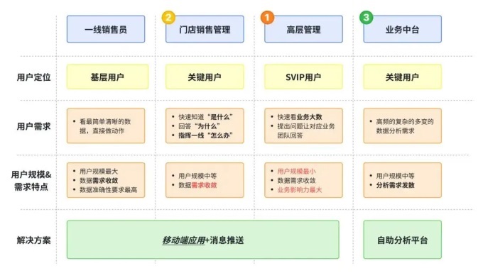 处理哪个用户群的数据需求是团队在业务中首先需要回答的问题。基于用户规模、需求类型和业务知名度的选择原则,我们优先考虑处理高管团队的需求,其次是销售管理团队,然后是业务中台团队,最后是一线销售人员。