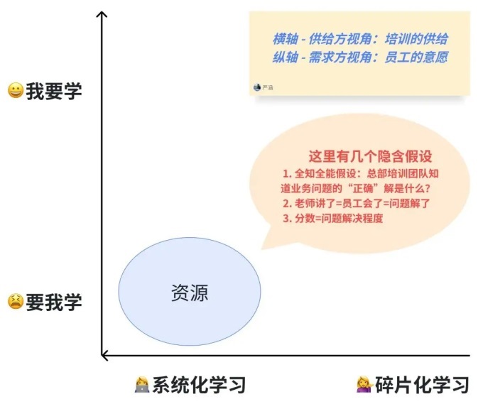 培训场景分为两个方面:供给方的培训形式(从碎片化学习到系统学习)和需求方的员工意愿(从要求我学习到我想学习)。这两个方面基本上可以涵盖所有的训练场景。在公司组织的大规模脉冲式培训中,我们观察到大部分培训资源都投入了员工的参与和学习。在这一场景中,有三个假设:全知全能(训练团队知道所有问题的正确解决方案)、教学等于学习(老师讲了员工的话)、分数等于解决问题的水平(分数高意味着解决问题的程度高)。