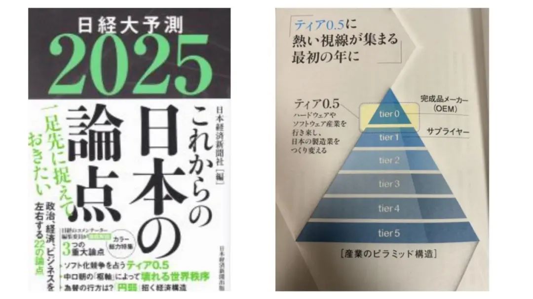 日经2024年11月出版的《日本未来论点》 在日经大预测2025中,智能驾驶领域的科技企业被称为0.5级供应商(下图),这意味着与汽车零部件供应商和原始设备制造商的主从关系不同。科技企业和原始设备制造商关系平等,拥有传统供应商没有的AI或数字技术,在车辆中心系统中发挥作用,实现智能驾驶。换句话说,中国智能驾驶科技有限公司闯入汽车领域,动摇了日本汽车供应系统近100年的上下级关系,打破了原始设备制造商统一世界的金字塔局面。