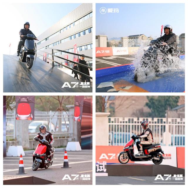 为全面验证爱玛 A7Plus 爱玛集团电瓶车事业部总裁高辉、央视主持人郭若天在各方面的表现,与众多媒体和经销商化身爱玛。 A7Plus “试骑官”,在直线竟速阶段感受“风速”的快感,挑战绕桩、上坡、颠簸路段、砂石路面、过水、模拟冰雪路面,提前为消费者感受一下爱玛 A7Plus 硬核设计,强大动力,舒适体验,智能进化与“人车合一”。
