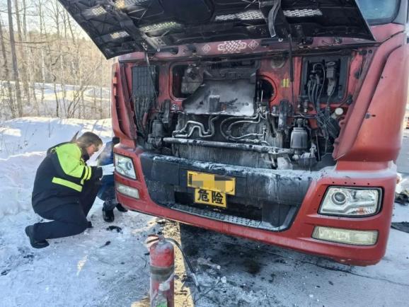 近日,大兴安岭新林区公安局交警大队民警巡逻时,发现路边停着一辆卡车,民警立即下车询问情况。据了解,司机徐先生驾驶一辆卡车,与押运人员一起从大庆出发,前往漠河市运输柴油。当他到达目前的路段时,发动机盖因寒冷的天气而爆裂,火焰不断从车前冒出。因为车内的灭火器已经用完了,虽然火已经扑灭了一半以上,但还是有余火,紧急请求交警协助。